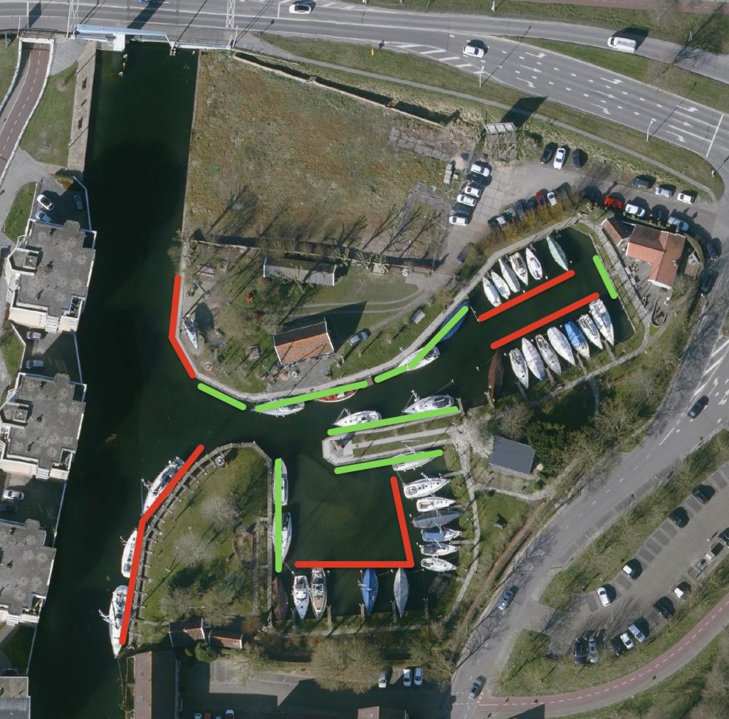 Als de havenmeester niet aanwezig is. Dan mag U gaan liggen bij de groene bordjes “vrij” aan de lengte steigers. Zie groene markering op onderstaande foto. Wel graag goed aansluiten aub.